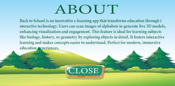 About Us: Back to School is an innovative e-learning app that transforms education through interactive technology. Users can scan images of alphabets to generate live 3D models, enhancing visualization and engagement. This feature is ideal for learning subjects like biology, history, or geometry by exploring objects in detail. It fosters interactive learning and makes concepts easier to understand. Perfect for modern, immersive education experiences.